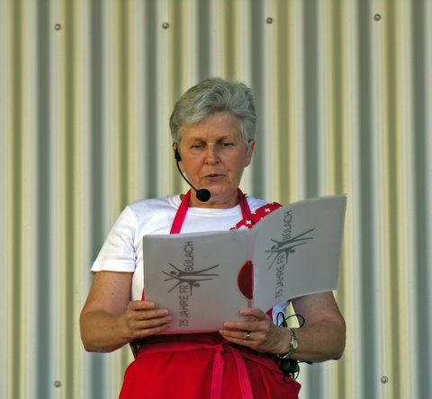 Gwüsst hämmer, dass im Jahr 1932 es Grüppli Fraue eusi Fraueriege gründet hät. Das Grüppli isch gwachse und über Jahre ghegt und pflägt worde. Drum hämmer au öppis Bsunders für euses Jubiläum welle. Und da isch doch de Wunsch vonere neue Fahne die beschti Glägeheit gsi. E Fahneweih – das isch es ! D’Marianne hät sich voller Begeischterig a d’Arbet gmacht und s’Resultat isch e wunderschöni Fahne – e Fahne, wo sich so richtig schwinge laat. Ich denke, alli, wo d’Marianne gseh händ, wie sie gschtrahled hät, teiled d’Meinig, dass es halt scho schön isch, mit so nere Fahne mitlaufe z’chönne. Bi dere Glägeheit möchte mir nomol allne Spänder ganz härzlich danke. En spezielle Dank au em TV, wo euse Fahnegötti isch.