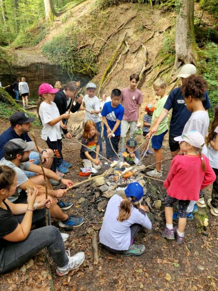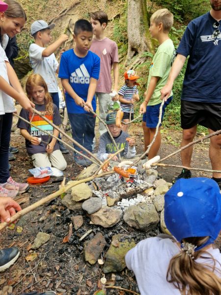 Nach diesen Abenteuern verliessen wir den Tierpark und wanderten zu einem kleinen Wasserlauf, um dort zu grillieren. Wir suchten sogleich Stöcke für die Cervelats und Bratwürste und das Feuer wurde in der Zwischenzeit entfacht.